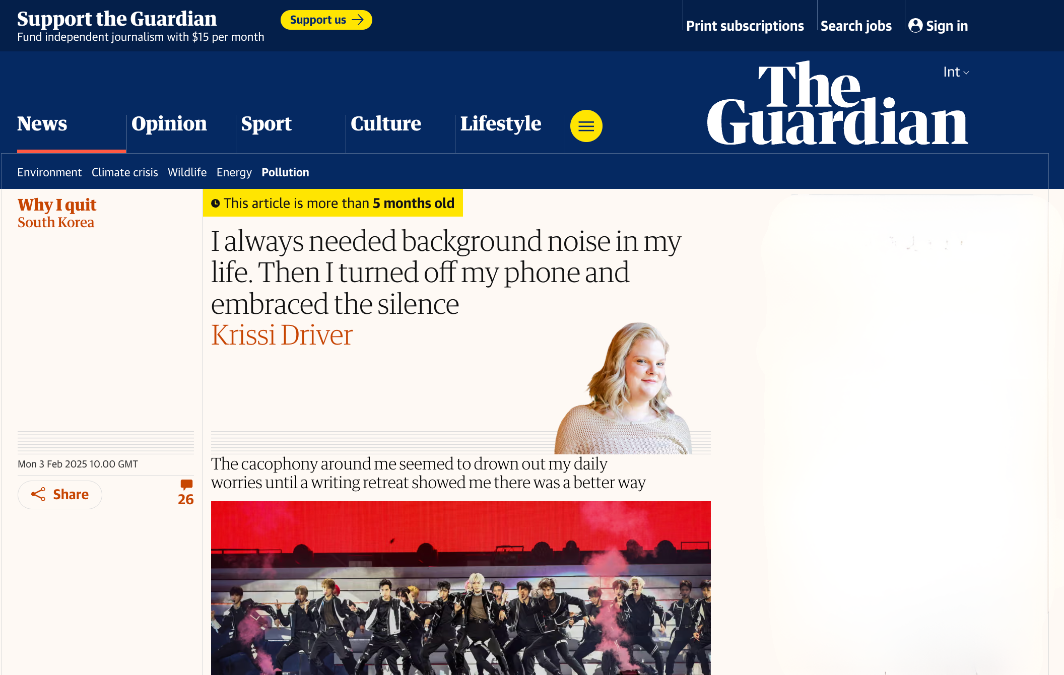 I wrote a personal essay for The Guardian UK’s ongoing series, “Why I Quit.” My piece focused on the overwhelming amount of background noise I’d allowed into my day-to-day life, and how I went about finding peace and more space for my own thoughts.